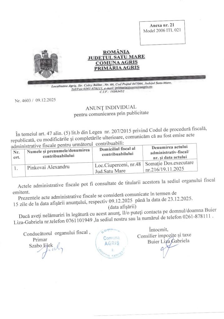 10 dec. Anunt individual nr.4603-2025 Posted at 08:52h in Anunturi, Anunturi 2025 by lacikasimon 0 Comments 0 Likes Descarcare PDF: Anunt individual nr.4603-2025